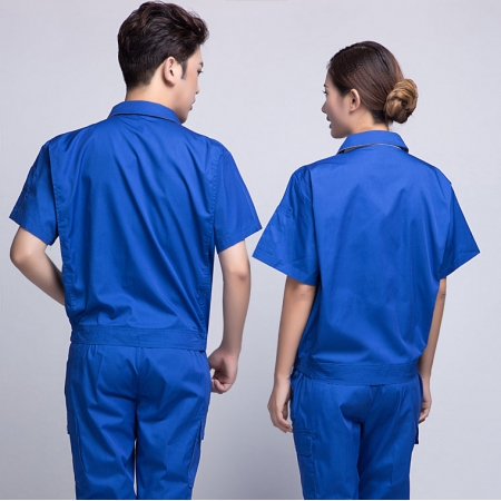苏州鹰诺服装:深蓝配桔红短袖工作服AD069