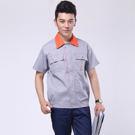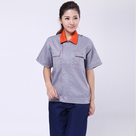 苏州鹰诺服装:浅灰拼橘黄短袖工作服AD057-DX