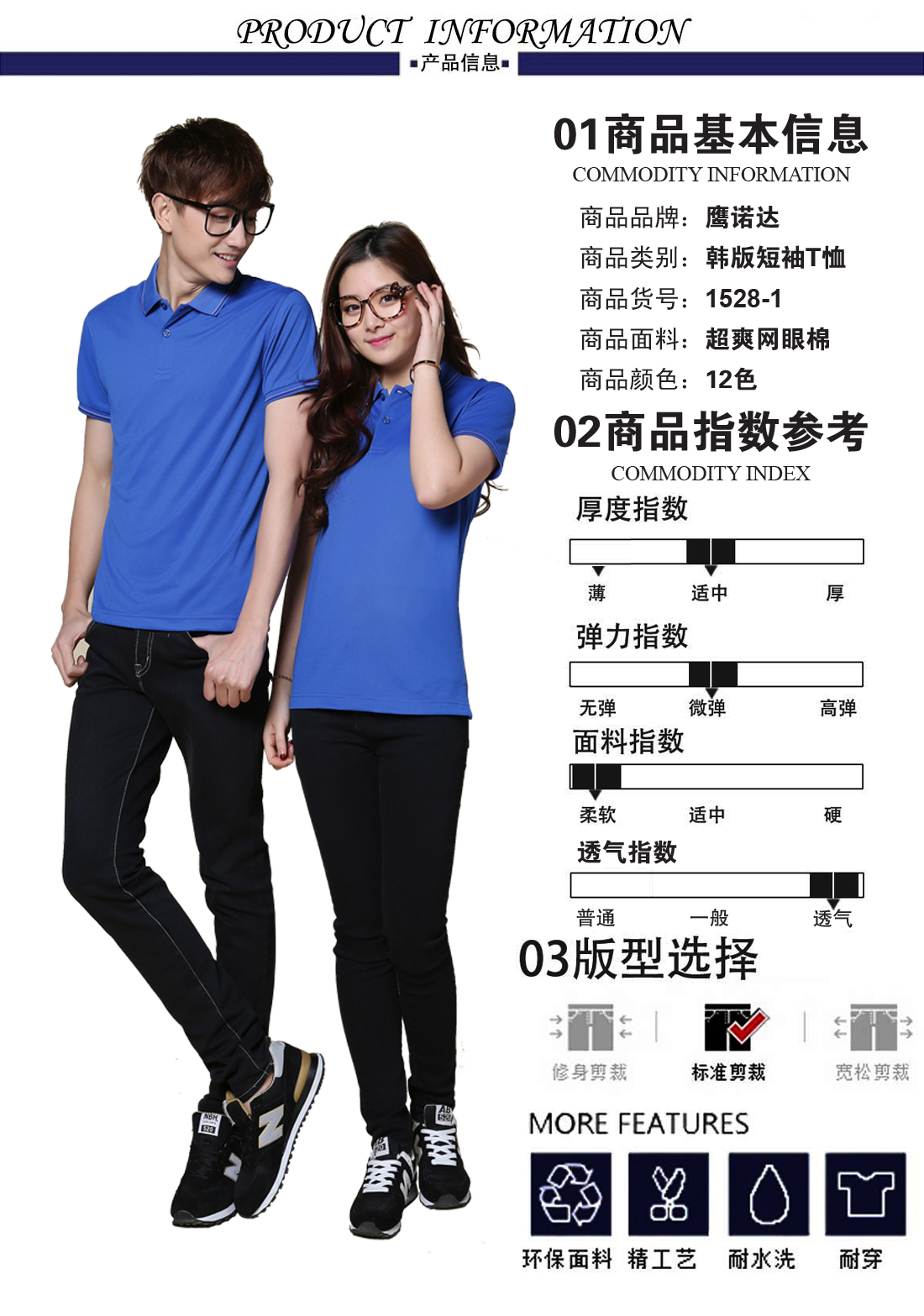 牛蓝提花翻领超爽网眼棉T恤衫ID1528-1